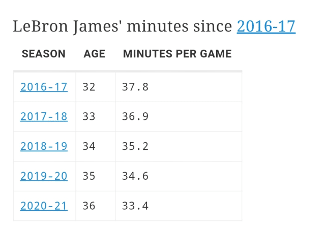 新赛季,詹姆斯又老了一岁,他的场均出场时间预计会继续下降。Buha列出了詹姆斯自2016-17赛季场均上场时间的变化,从37.8分钟递减到上赛季的33.4分钟。新赛季,Buha预计詹姆斯的场均出场时间在31-32分钟之间,新援威少将为詹姆斯减轻组织进攻方面的压力。