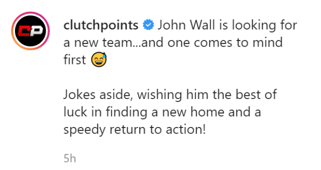 美媒clutchpoints则晒出沃尔身披湖人球衣的P图,詹姆斯手持至少30岁的牌子。他们调侃道:“沃尔寻找一支新的球队,我第一个想到的就是湖人。把玩笑放到一边,祝沃尔好运找到一个新家,尽快复出。”
