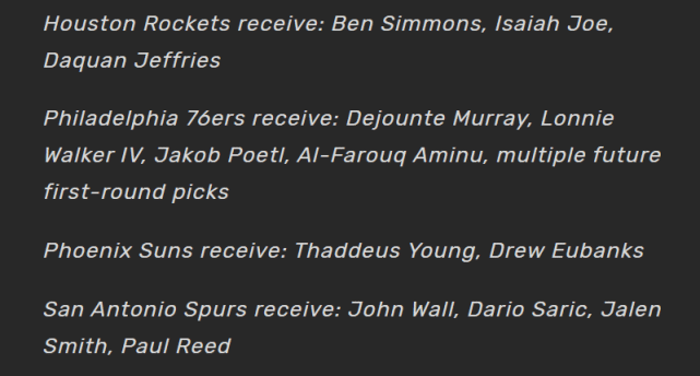 火箭得到本-西蒙斯、伊塞亚-乔、杰弗利斯;76人得到德章泰-穆雷、朗尼-沃克、珀尔特尔、阿米努和多个选秀签;太阳得到赛迪斯-杨和尤班克斯;马刺得到沃尔、萨里奇、杰伦-史密斯和保罗-里德。