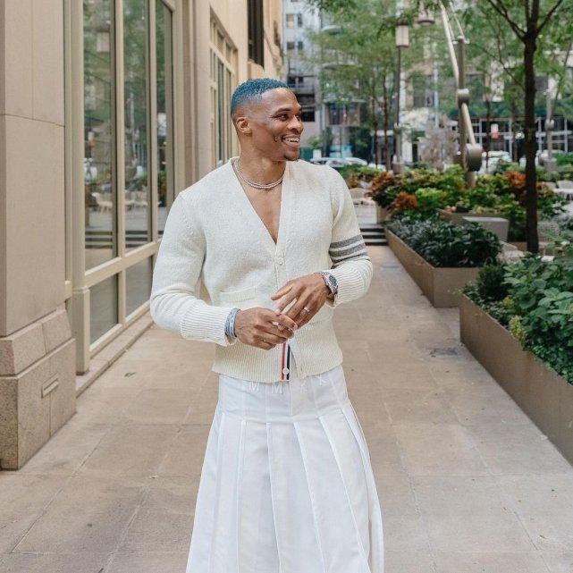夸梅布朗点评的是此前威少的装备,一直被认为是时尚达人的威少,近期穿了白裙子和黑靴子进行街拍,而且还把头发染成了蓝色!他今日在出席MetGala红毯前接受了采访表示“蓝色是我最喜欢的颜色,夏休期里我有点无聊,在赛季期间,你处于比赛之中的模式,不太关注这些。但是在红毯之上,你非常关注你的站姿,你的外表。比如你的服装上身效果如何”