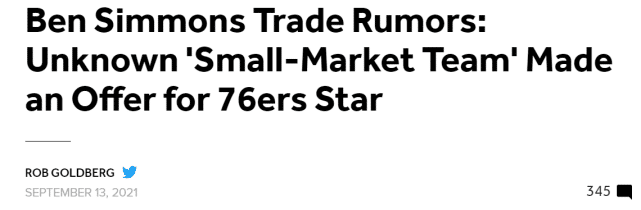 The Athletic报道,国王曾和76人谈过在西蒙斯的交易,但国王认为76人的要价太高,不愿意付出队内的福克斯或者哈利伯顿。勇士也曾和76人有过交流,双方并没有找到一个能让彼此接受的现实报价。名记马克-斯坦恩报道,骑士是另一支对西蒙斯感兴趣的球队。