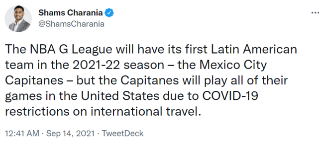 来源:JRS直播网09-14 09:53JRS直播网9月14日讯,据名记查拉尼亚报道,NBA发展联盟(G联赛)将在下赛季迎来第一支拉丁美洲的球队——墨西哥城卡皮坦内斯(Mexico City Capitanes)。由于疫情防控的原因,卡皮坦内斯队下赛季的比赛将都会在美国境内进行。