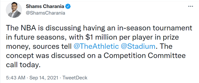 除了发展联盟增加新球队,联盟还讨论了NBA增加季中锦标赛的可能性。据查拉尼亚报道,联盟管理层在今天的电话会议上讨论了季中锦标赛。季中锦标赛将会决出一个冠军,而在季中锦标赛夺冠的球队,每名球员可以获得100万美元奖励。