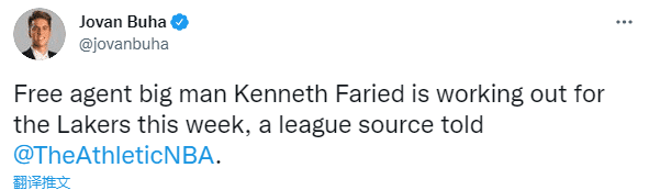 来源:JRS直播网09-14 09:43JRS直播网9月14日讯,湖人又一引援目标曝光,据湖人记者Jovan Buha报道,湖人将在本周试训自由球员“半兽人”肯尼斯-法里埃德。