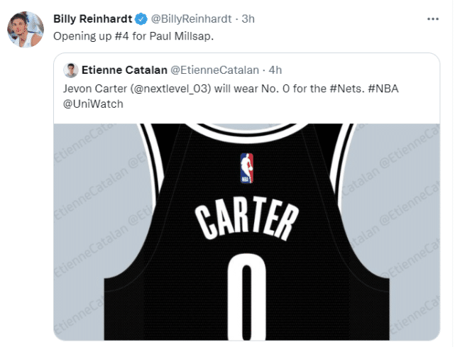 不久前,篮网刚刚官方宣布了米尔萨普签约的消息,米尔萨普进入联盟后只穿过两个号码。效力爵士时穿24号,此后在老鹰、掘金都穿4号。杰旺-卡特让号的举动,让米尔萨普可以继续身披篮网4号球衣作战。