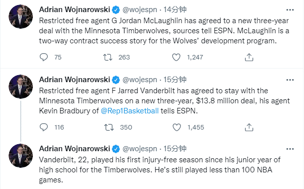来源:JRS直播网09-11 09:34JRS直播网9月11日讯 ,据espn名记沃纳罗斯基报道,森林狼连续签约两名球员,3年1380万美元续约范德比尔特,3年650万美元续约麦克劳林,双向合同球员终于获得正式合同。