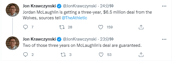 上赛季,麦克劳林在森林狼拿着一份双向合同,他为森林狼出战51场比赛,场均替补上场18.4分钟能够得到5分2.1篮板和3.8助攻;从发展联盟到森林狼替补,现在又拿到一份3年正式合同,如此事件太励志。森林狼记者Jon Krawczynski跟进报道,麦克劳林和森林狼新签的3年合同,合同中前两年的薪资是保障的。