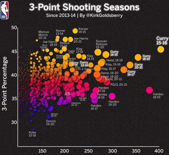 近日一项数据统计象限图出炉,是关于三分球手的。纵坐标代表的是三分球的命中率,而横坐标则是命中总次数。限定范围是一个赛季(从13-14赛季到上赛季),从该象限图可以看到,三分球命中率在超过40%的基础前提之下,只有一人的单赛季三分球命总次数可以超过300记,此人就是库里。