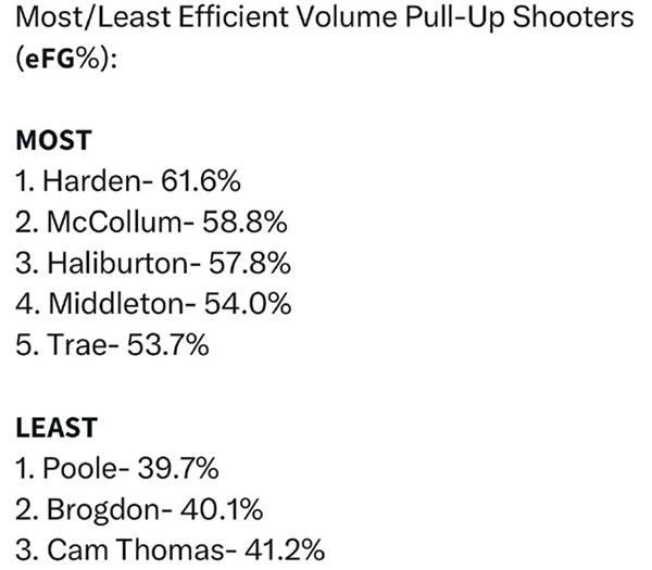 普尔的表现不佳,多个数据都排名垫底,本赛季持球跳投有效命中率排行,快船的哈登以61.6%的命中率排名联盟第一,普尔39.7%倒数第一。