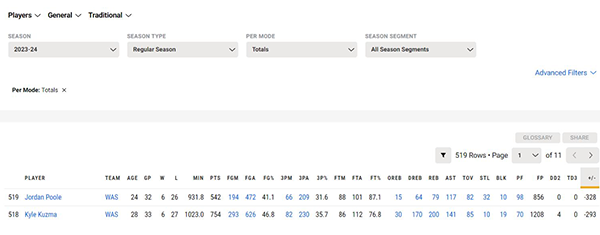 普尔赛季正负值已经来到了-328(32场),也是本赛季所有球员中唯一一个正负值跌破-300大关的球员,排名垫底。