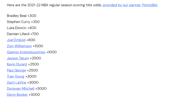 来源:JRS直播网09-08 19:28JRS直播网9月08日讯新赛季关于总冠军的归属,关于常规赛MVP的归属,都是人们讨论和关注的话题。当然得分王也是大家所为之关注的焦点,那么最新一个赛季,哪名球员最被看好成为得分王呢?新赛季得分王赔率最新出炉,排名第一的是来自奇才的比尔,力压NBA众多球员排在这一榜单第一名,赔率为+300。