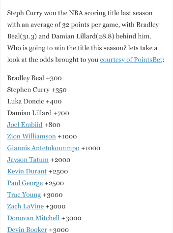 在媒体的赔率表中,锡安和字母哥这两个人都被赋予了+1000的赔率,而他们两人的相似之处就是都以内线得分为主。上赛季仅仅是二年级的锡安已经场均拿到了27分,而字母哥作为两届的MVP球员更加是连续几个赛季场均27分左右。然而在这个以外线投射为主的联盟中,很少会有以内线得分为主的球员拿到得分王,所以说他们的得分能力虽然很强,可是赔率就要稍微低一点了。