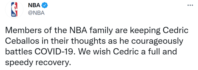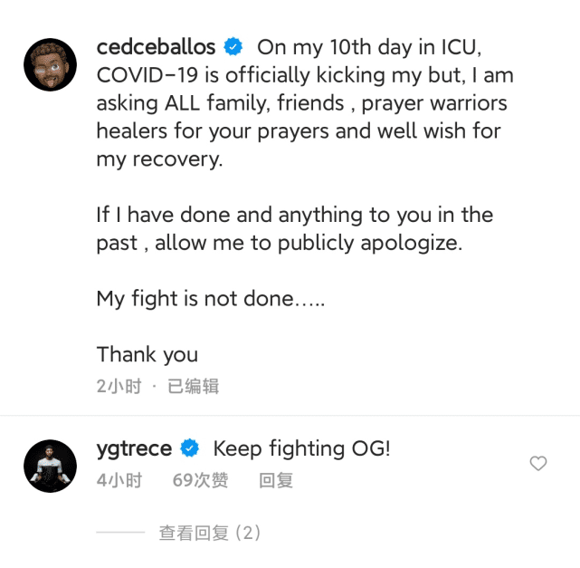 现年52岁的塞巴洛斯写道:“这是我进入ICU(重症监护室)的第10天,新冠病毒在踹我的屁股,我希望所有的家人、朋友、战士、治疗师们都能为我的康复送上祈祷和祝福。如果我过去有得罪你们的地方,请允许我公开致歉。我的战斗不会就此停止……谢谢你们。”