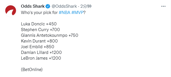 最新MVP赔率出炉!东契奇力压库里KD高居第一,詹姆斯并列垫底