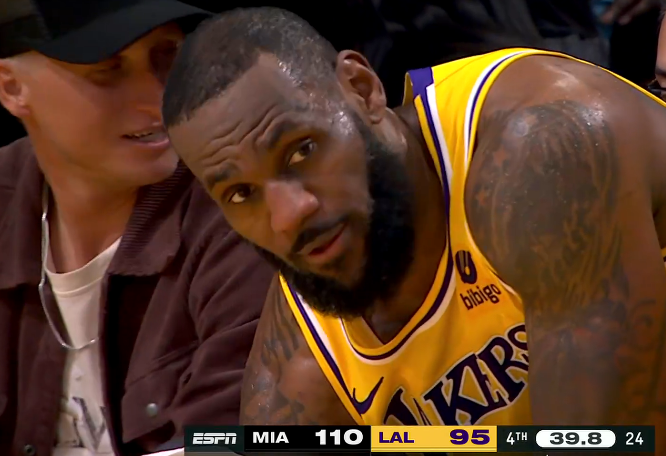 末节詹姆斯快攻得分,里夫斯命中三分,老詹助攻浓眉暴扣,可热火外线三分神准,邓罗接连轰进3记三分助热火扩大领先,关键追分时刻浓眉传球失误,暂停时詹姆斯一脸沮丧的表情;暂停回来,詹姆斯被哈克斯迎射,老詹突破上篮回应,理查德森关键三分,老詹上篮和三分打铁,提前认输沮丧下场,最终湖人输掉比赛.