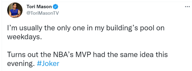 来源:JRS直播网09-02 15:29JRS直播网9月02日讯 ,丹佛CBS电视台女主播Tori Mason更新社媒,晒出了一张自己和约基奇的合影。她配文写道:“通常周末的泳池里只有我自己,看来NBA的MVP今晚也有同样的想法。Joker(小丑,约基奇的绰号)”