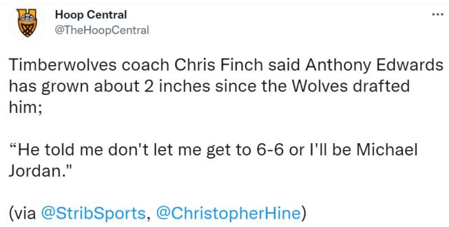 芬奇表示“他曾跟我说,不要让他长到6英尺6英寸(1.98米),否则他就会成为迈克尔-乔丹,森林狼至少能打进季后赛”曾许下这样的豪言壮语,不禁让人对新赛季的华子更加期待了!上赛季虽然不敌三球没拿到最佳新秀,但他的表现也很出彩,场均19.3分4.7个篮板2.9次助攻1.14个抢断,赛季后半段表现十分出色!