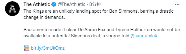 名记SamAmick透露76人和国王几乎谈崩的真因:国王在谈判中明确表示他们不会将达龙-福克斯和泰雷斯-哈利伯顿放入到西蒙斯的交易当中,国王内部希望在核心阵容保持不变的情况下进入球队训练营。国王球员巴迪-希尔德和马文-巴格利是被认为最有可能被加入到交易中的球员。