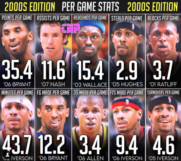 美媒晒00年代十大单赛季最高数据!科比称霸得分!艾弗森独占3席