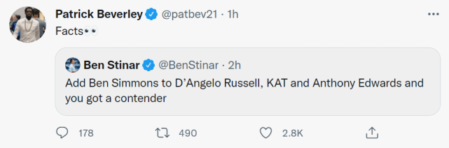 谈到西蒙斯下家时,NBA记者Ben Stinar写道:“本-西蒙斯加上德安吉洛-拉塞尔,唐斯和安东尼-爱德华兹,这支球队会成为一个有力的竞争者。”随后,森林狼新援贝弗利转发该记者推特并写道:“事实。”