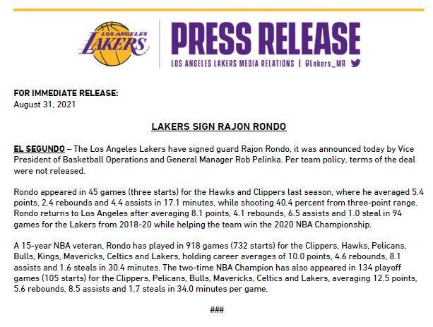 来源:JRS直播网09-01 10:08JRS直播网讯 北京时间9月1日,湖人官方宣布球队已经和后卫拉简-朗多正式签约。据此前报道,朗多和湖人签下的是一份1年260万美元的合同。湖人第一时间为朗多召开了新闻发布会,正式欢迎这位老将回归。新赛季, 朗多预计改穿4号球衣。