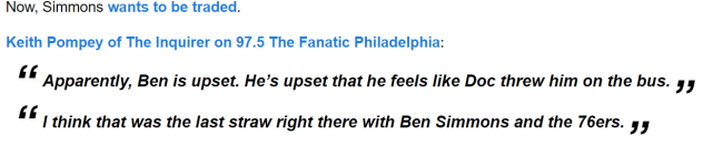 西蒙斯在季后赛的罚球表现糟糕。在76人止步东部半决赛后,里弗斯在赛后采访中表示,自己不确定西蒙斯能否胜任一支冠军球队的组织后卫。“显然,本(西蒙斯)感到沮丧,他很沮丧,他认为自己就像被道格(里弗斯)抛弃了,”Keith Pompey写道,“我认为那是西蒙斯和76人之间的最后一根稻草。”换言之,里弗斯的言论,压断了最后一根稻草,彻底让西蒙斯和76人翻脸了。