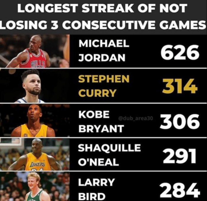 可以说,库里在314场比赛没连续输过三场比赛,这已然是十分了不起的成就了。前五名球员中,也就一人还在NBA联盟效力,还未退役,这就是库里。至于詹姆斯和杜兰特这两大现役NBA第一人竞争者,并未能跻身该榜单前五,反倒是库里可以排在第二名,对于这一数据结果,你是否感到意外呢?
