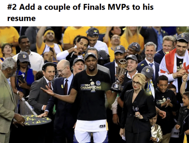 要想列入GOAT的讨论,杜兰特的冠军数量还不够,美媒认为他至少还得再拿两个总冠军。如果他能将总冠军数量增加至四个,他的GOAT履历会有明显提升。毕竟,进入类似的讨论,需要有一些硬核的荣誉,而总冠军数量是最重要的条件之一。