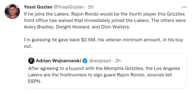薪金专家Yossi Gozlan在社媒上写道:“如果朗多加盟湖人,他将是灰熊队第四位被裁后很快加入湖人的球员,其他三位是布拉德利、霍华德和维特斯。”Gozlan猜测朗多为了买断放弃260万美元的薪水,这也是他未来底薪加盟其他球队的金额。