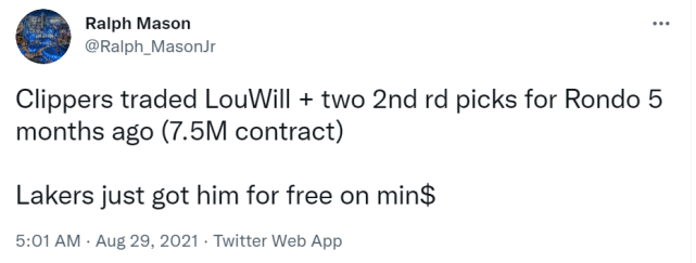 湖人很可能只用底薪签到朗多,也让快船之前的运作遭到调侃。专家拉夫-梅森写道:“快船在5个月前用路威和两个次轮签才得到朗多,而湖人有可能几乎免费得到他。”