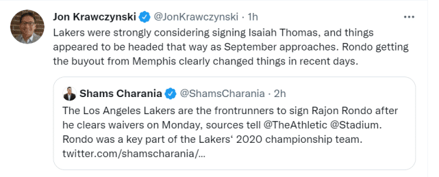 有人欢喜有人忧。朗多若重回湖人,那意味着小托马斯签约湖人的可能性几乎为零了。NBA记者Jon Krawczynski报道称,湖人曾经强烈考虑签约小托马斯,但随着9月的临近,朗多通过买断离开孟菲斯,让一切发生了变化。