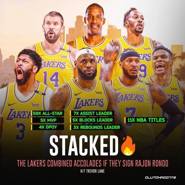 湖人记者Trevor Lane已经迫不及待地统计了朗多回归后的总成就:59次入选全明星、5次常规赛MVP、4次最佳防守球员、7次赛季助攻王(包揽过去4年)、5次盖帽王、3次篮板王和11次总冠军。