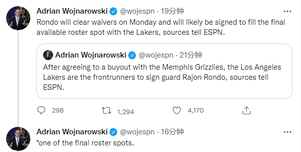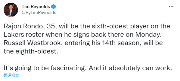 名记沃纳罗斯基报道,和灰熊达成买断之后,朗多很有可能在度过澄清期后签约湖人;另一名记Tim Reynolds报道,朗多将在下周二签约湖人,35岁的他将成为湖人队内年龄第六大的球员,威少开始他的第14个赛季,成为湖人队内第八老的球员。