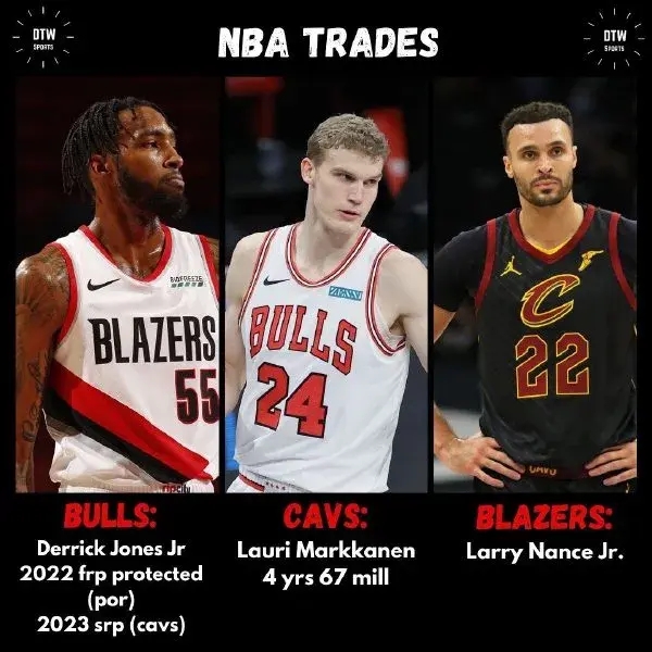 具体是公牛得到小琼斯、受保护首轮签和23年来自掘金的受保护次轮签;开拓者拿下小南斯;骑士则交易到马尔卡宁。