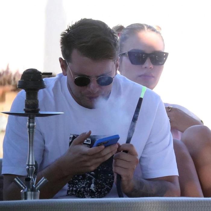 东契奇和女友一起度假,身穿白色T恤、戴着墨镜十分帅气,刷着手机抽水烟,吞云吐雾太有氛围;东契奇女友坐在他身旁,也带着一副墨镜。