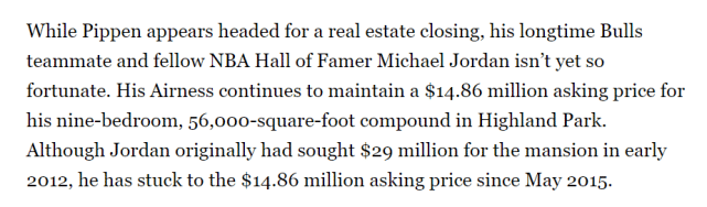 皮蓬总算是把芝加哥的房产卖掉了,相比之下,他的前队友乔丹就没那么幸运了。飞人在离皮蓬家不远的地方拥有一套占地56000平方英尺(约5202平方米)的豪宅,最初在2012年挂牌出售,当时挂牌价高达2900万美元,如今多次降价后,挂牌价已经变成1486万美元,差不多只有原来的一半,但依然无人问津。