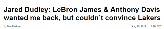 “我原以为自己能回到湖人,”杜德利在采访中说道,“这太疯狂了。显然,勒布朗(詹姆斯)和AD(浓眉)都希望留下我,但我们就是无法说服他们(管理层)。”