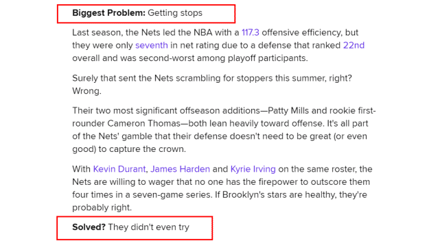 篮网最大问题是防守!美媒调侃休赛期运作:解决?他们连试都没试