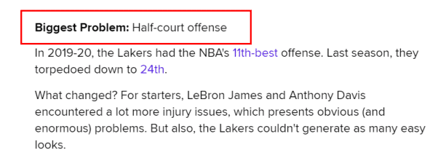 相比之下,湖人的最大问题是什么?B/R认为是半场进攻,看上去和篮网正好是相反的。