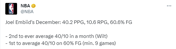 据NBA官方统计,恩比德单月场均得到40.2分成为继张伯伦之后第二单月场均40+的球员,也成为了NBA历史首位单月同时至少场均得分40+篮板10+且命中率60%+的球员(至少打9场)。