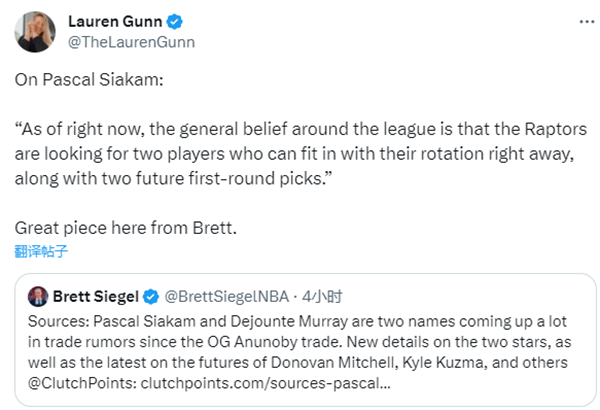 在猛龙完成阿奴诺比的交易后,他们预计在西亚卡姆的要价上将保持灵活,联盟普遍认为他们的要价为两名轮换球员加两个未来首轮选秀权。