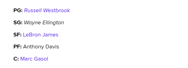 湖人首发:威少+埃灵顿+詹姆斯+浓眉+小加索尔