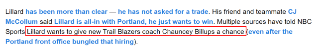 NBC体育报道称:利拉德还没有提出交易申请。他的好友麦科勒姆说利拉德全身心投入于波特兰,他只想赢球。多个消息源告知NBC体育,利拉德想给新任开拓者主帅昌西-比卢普斯一次机会。