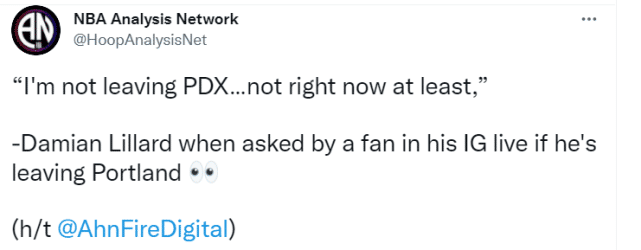 在社媒直播中,一个球迷问利拉德:“你为什么要离开波特兰?”利拉德的回答是:“我不会离开波特兰,至少现在不会(I'm not leaving PDX, not right now at least)。”