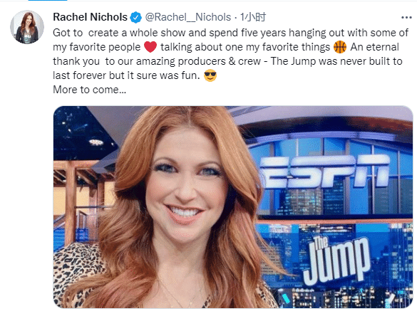 瑞秋-尼科尔斯发推告别ESPN,晒照并且发文:制作了一个完整的节目,花了五年时间和我最喜欢的人在一起谈论一件我最喜欢的事情(篮球,永远感谢我们了不起的制片人和剧组——《The Jump》从来都不是为了永远持续下去而设计的,但它确实很有趣。