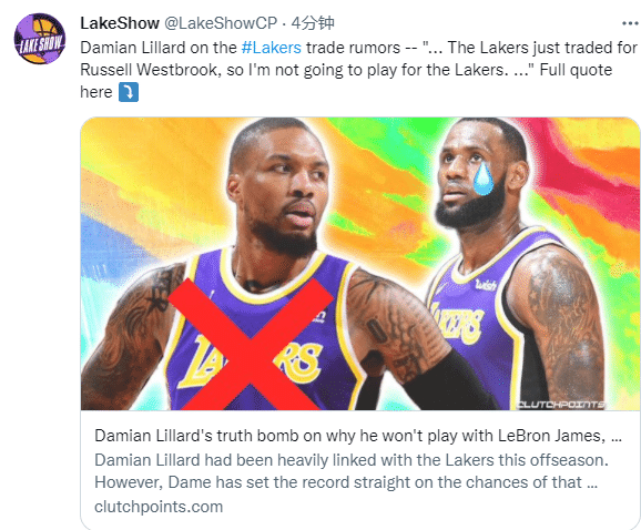 此前有球迷在社交媒体上表示我敢打赌,当赛季开始时,利拉德会为湖人队效力;如今利拉德再次表态自己不会加盟湖人,他表示:湖人已经交易得到威少,所以我不会为湖人队效力。我和威少打相同的位置,所以我敢和他(球迷)赌一百万美元。