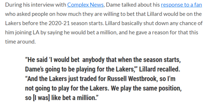 不想联手詹姆斯?利拉德回应打赌100万:因为威少我不会加盟湖人
