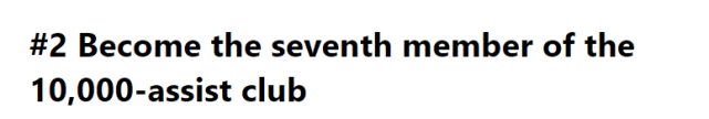 詹姆斯不但擅长得分,而且有极强的组织进攻能力。生涯至今18个赛季,詹姆斯场均送出7.4次助攻,目前,他的生涯总助攻数是9696次,排在历史第8位。2021-22赛季,詹姆斯有望成为史上第7位至少送出10000次助攻的球员,加入斯托克顿、基德、纳什、马克-杰克逊、保罗、“魔术师”约翰逊的行列。他距离这一里程碑还差304次助攻,生涯至今,詹姆斯每个赛季的助攻数都能超过这个数字,即便上赛季只打了45场比赛,也不例外。
