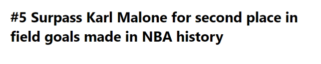 生涯至今,詹姆斯已经投中12903球,距离排名第二的卡尔-马龙(13528球)只差625球。数据显示,詹姆斯一共有13个赛季至少投中625球,他有很大的可能性再次做到,超越马龙,升至历史第二。