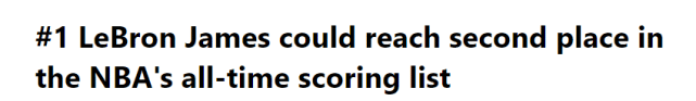 生涯至今,詹姆斯已经得到35367分,距离排名第二的卡尔-马龙(36928分)还差1561分。美媒表示,如果詹姆斯以场均22.5分的表现打上70场比赛,他就能超过马龙,升至历史第二。詹姆斯还有机会在新赛季解锁37000分里程碑,此前在联盟历史上,只有“天勾”贾巴尔达到过这一高度。
